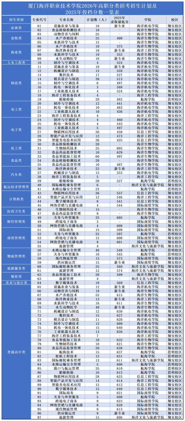 厦门海洋职业技术学院2026年高职分类招考招生计划