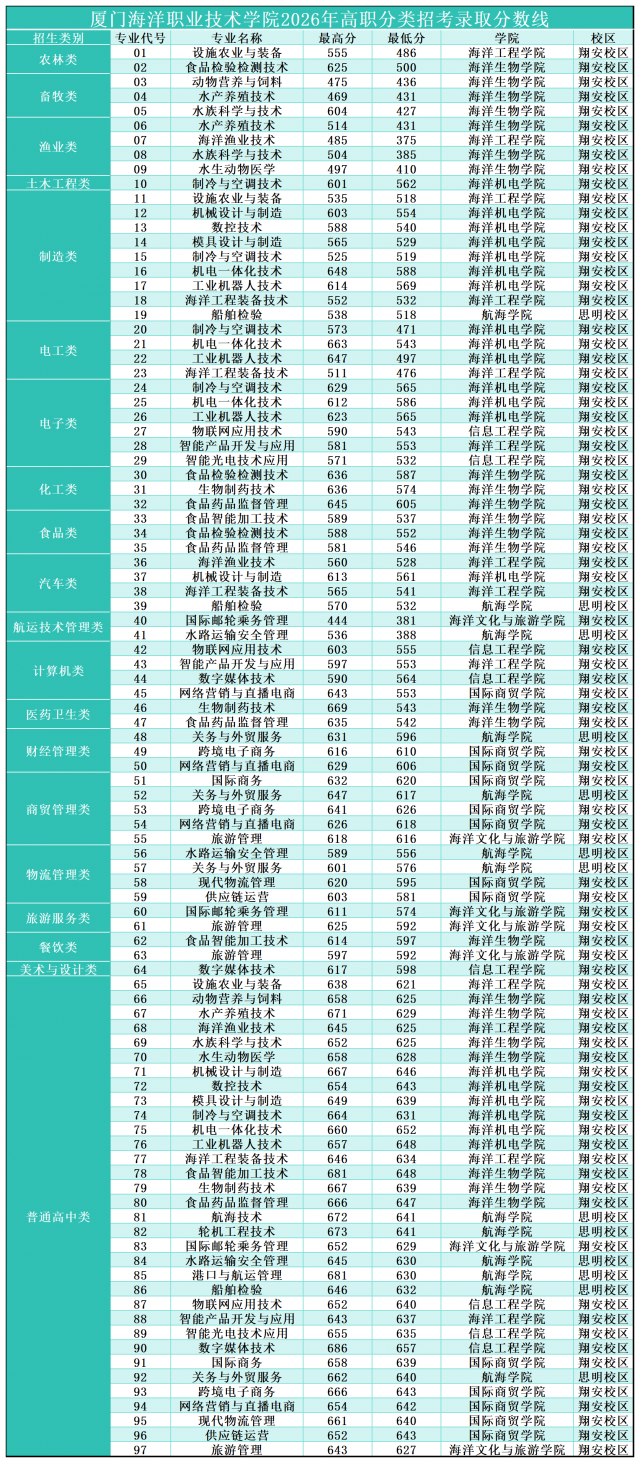 厦门海洋职业技术学院2026年高职分类考试投档分数情况