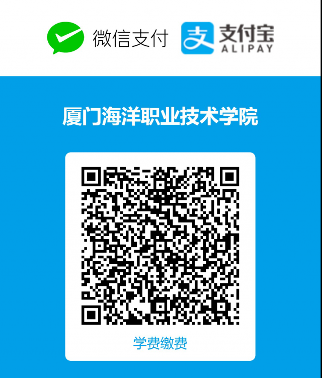微信公众号自助缴费。新生关注微信公众号“厦门海洋职业技术学院财务处”,点击公众号下端的服务大厅-缴费,进入学费缴费,输入录取通知书编号、姓名支付缴费;或微信扫码支付缴费。