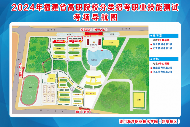 ★考生从翔安校区北门入校后,可按照校内的路线指示牌到达1号教学楼。我校候考场均在1号教学楼,渔业类、化工类专用考场均在1号实训楼,渔业类在2楼,化工类在3楼。