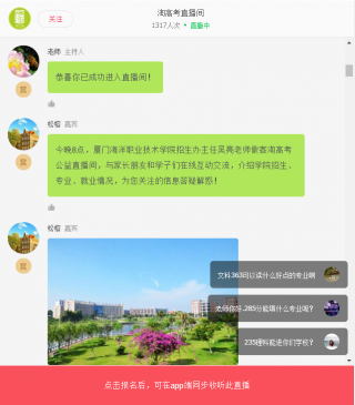 直播短短一小时内,千余人次进入直播间互动提问。专科过线怎么填报志愿?怎样填报志愿容易被厦门海洋学院录取?多少分能上厦门海洋学院某某专业?某某专业是学什么的?某某专业毕业后是做什么的?厦门海洋学院学校环境怎么样?厦门海洋学院宿舍条件怎么样?广大考生及家长就2017年高考志愿填报及录取等方面提出各种问题,我院招生办主任在直播中进行了详细解答。错过直播的同学不要着急,请按照文中提供的方法回放直播全程实录。