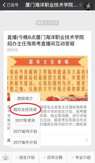 关注“厦门海洋职业技术学院招生办”官方微信公众号,点击菜单“招生计划”栏目中的“招办主任访谈”进行回放。