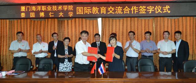 陈昌萍院长表示,通过本次签约,学院将谋求和泰国博仁大学乃至东盟更多高校的合作,学院把“走出去,引进来”作为学院贯彻国家“一带一路”发展倡议,打造海上丝绸之路互联互通、海洋合作、人文交流枢纽,服务厦门地域经济发展的有力抓手。从文化交流、学术互访、产业研究、学生升学等多方面谋求和泰国博仁大学乃至东盟更多高校的合作,开展和强化与“一带一路”倡议相关的教学、研究、人才培养和智力服务的国际化发展规划,将有助于厦门海洋职业技术学院这个百年老店在“一带一路”国家发展战略中取得更大的成果和更开放的局面。