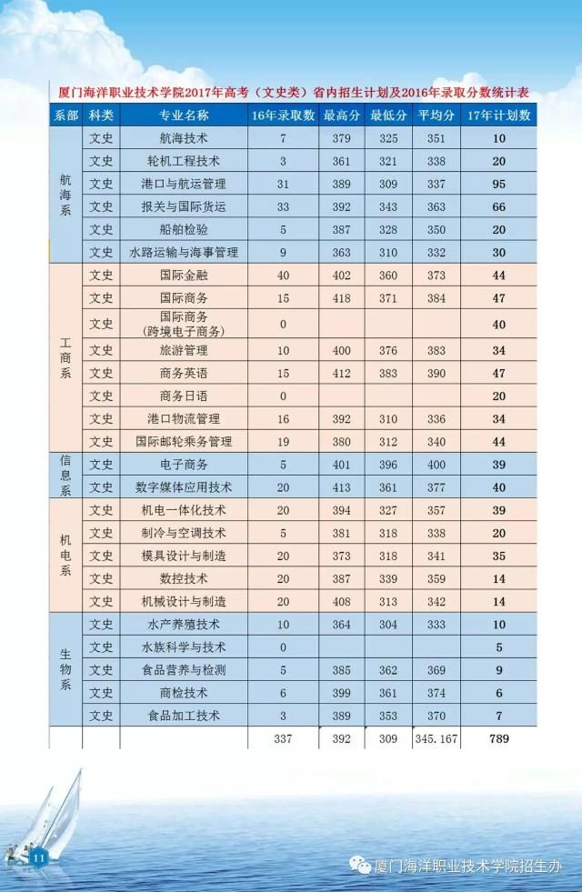 根据2016年录取情况与2017年招生计划数,填报我院招生计划数较多的专业被录取机率较大。理工类:港口物流管理(计划100人)、港口与航运管理(计划94人)、食品加工技术(计划75人)、食品营养与检测(计划65人)、智能终端技术与应用(计划46人)、水产养殖技术(计划30人)、水路运输与海事管理(计划25人);文史类:港口与航运管理(计划95人)、报关与国际货运(计划66人)、国际邮轮乘务管理(计划44人)、数字媒体应用技术(计划40人)、港口物流管理(计划34人)、水路运输与海事管理(计划30人)、制冷与空调技术(计划20人)。